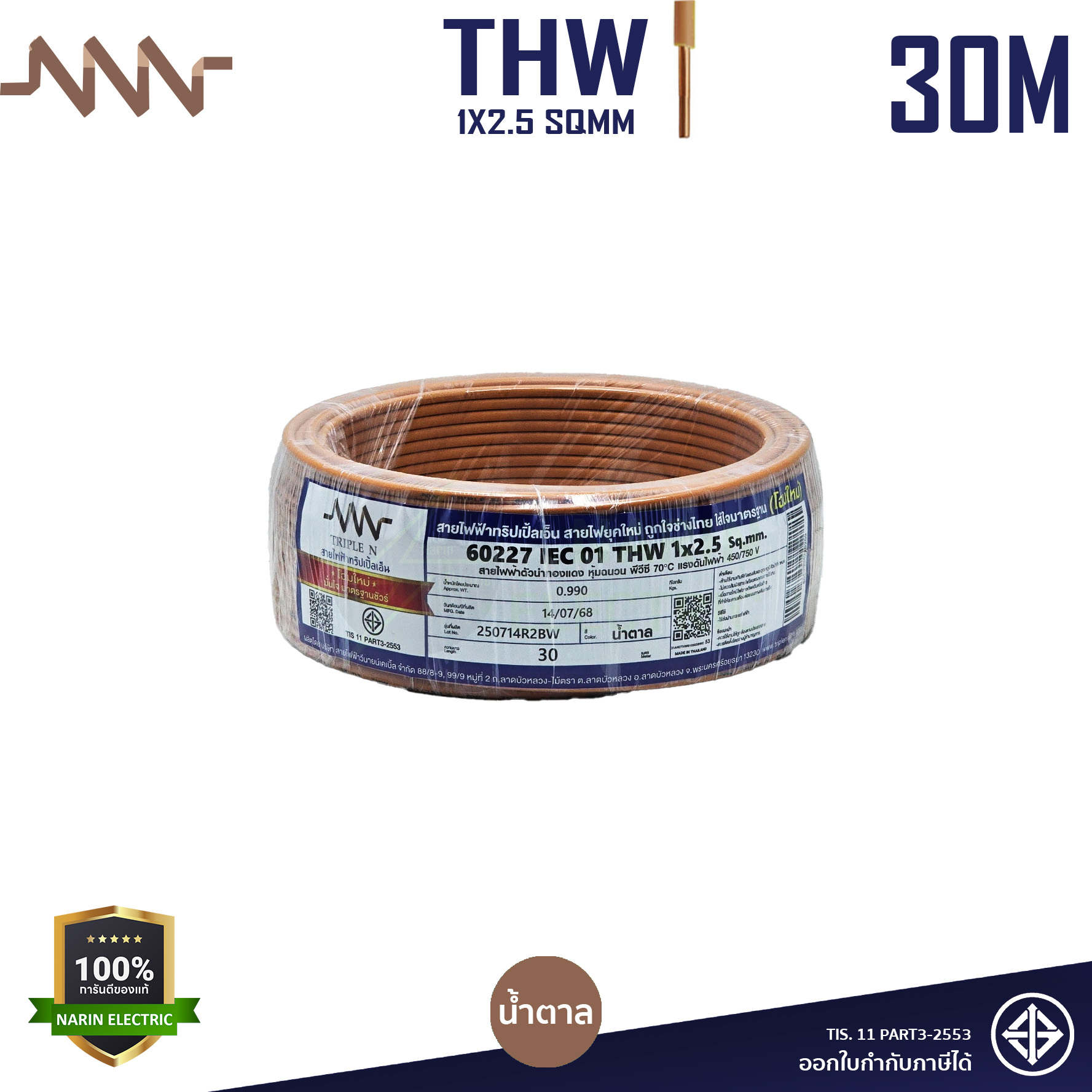 Tripple N NNN สายไฟ THW 1×2.5 ความยาว ขดละ 30 เมตร 60227 IEC01 สายเดี่ยว สายทองแดง 99% ทองแดงใหม่ พลาสติกใหม่ มีมอก.แท้ ขนาดตรงตามจริง