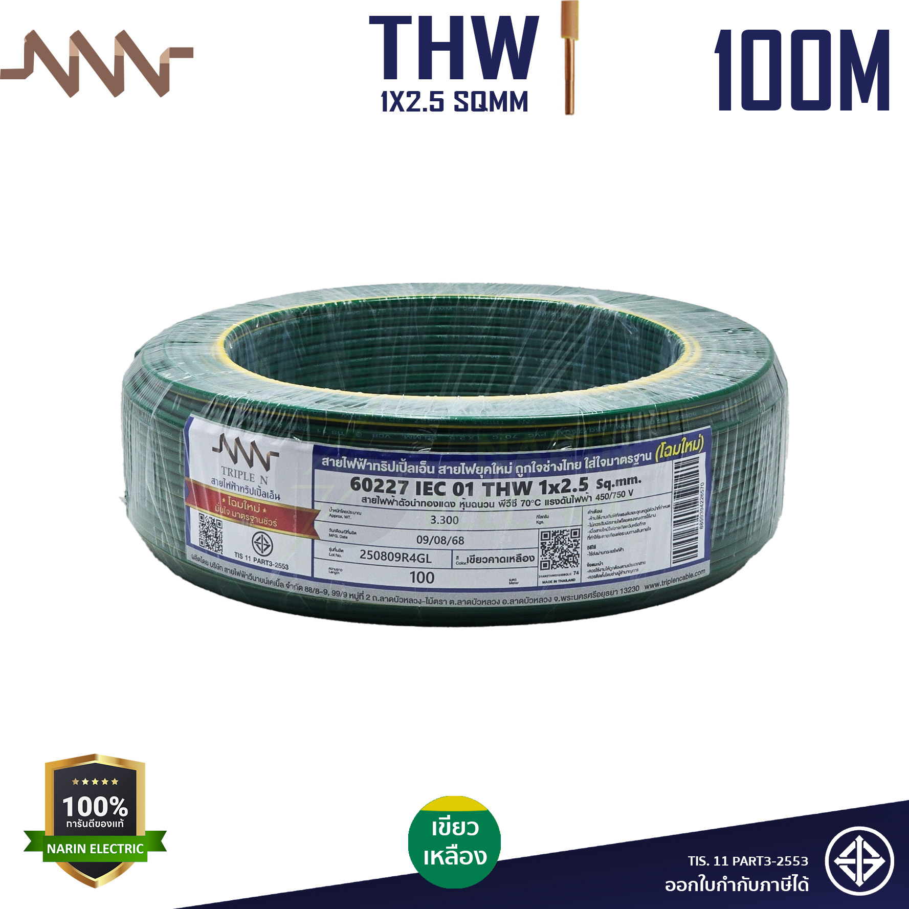 NNN สายไฟ THW 1×2.5 Sqmm สีเขียวคาดเหลือง 100 เมตร ทองแดง 60227IEC01